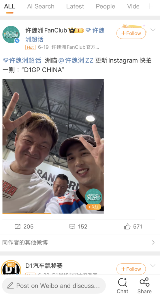 10月18日(第3戦)から10月19日(第4戦)に開催されるD1中国シリーズ東莞ラウンドまでいよいよあと3日! 今回は日本からその情報をゲットする方法を紹介しよう。当日のライブ配信はWeibo(中国でメジャーなフェイスブックやXのようなSNS)で視聴できるとのこと。アプリをダウンロードすれば登録なしでいけるそうだ。選手の投稿も見られるのでレッツトライ!
