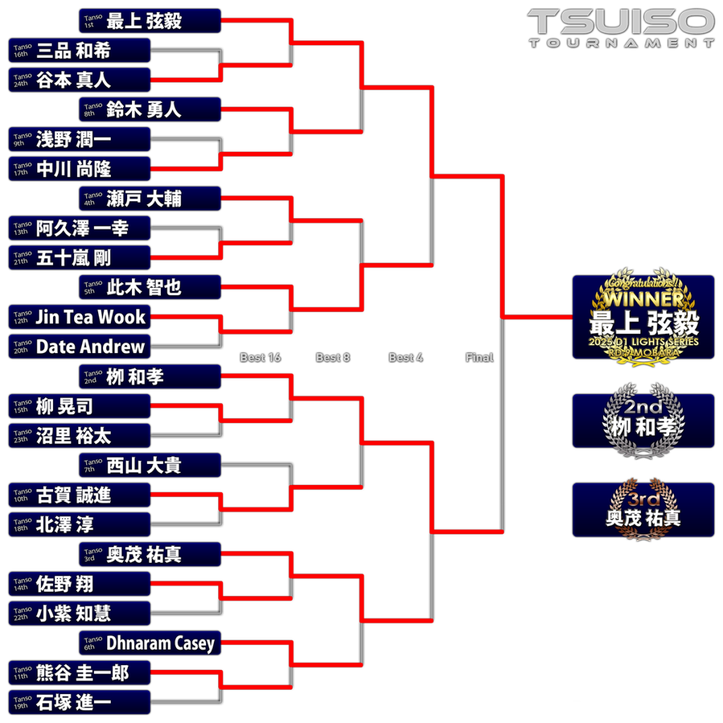 ベスト24では、かろうじてチャンピオン獲得の可能性を残していたランキング3位の浅野が破れ、タイトル争いから脱落。古賀とケーシは勝ち上がって望みをつないだ。