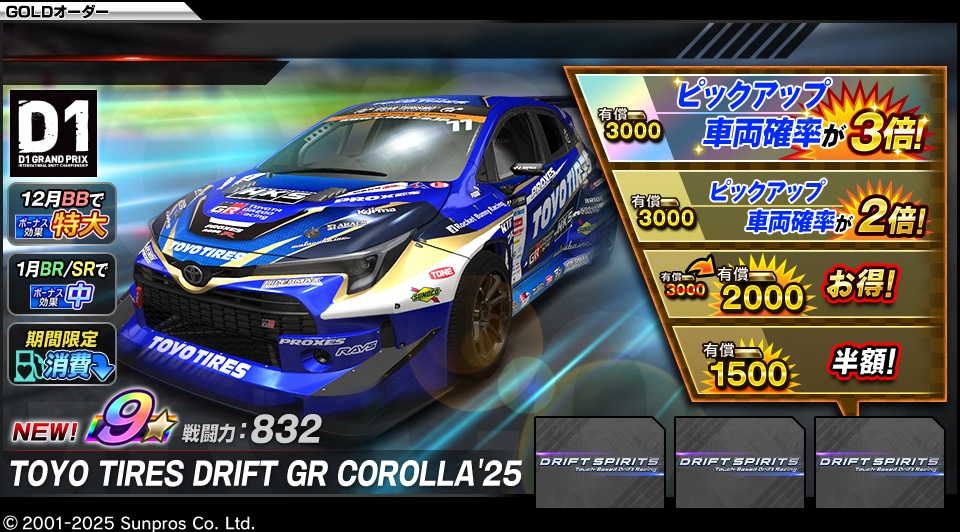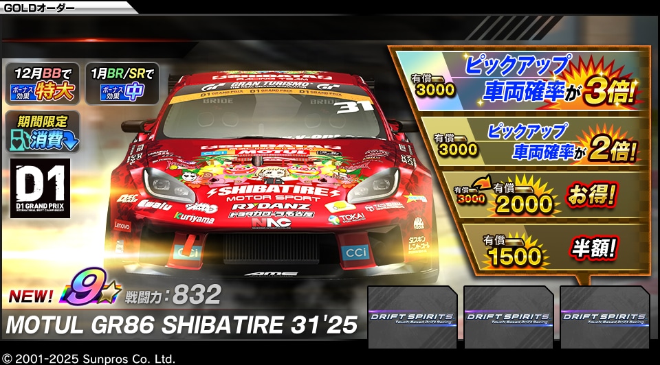 新☆9LEGENDオーダーには、松山北斗選手、蕎麦切広大選手の車両が新登場!いずれもD1コラボイベントでのボーナス効果付き!