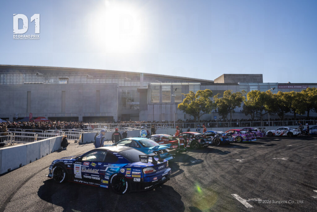 千葉県、幕張メッセの屋外会場にて行われた2026 D1GP KICK OFF DRIFT。普段の会場よりも間近でドリフトを体感することができ、西駐車場エリアにはドリフトを楽しみにしてくれているお客様で埋め尽くされていました。