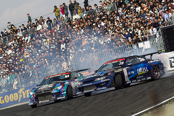 そして決勝のカードは佐久間vs川畑。おなじカラーリングのチームメイト同士の対決だ。1本目後追いの川畑は振り返しからタイミング、角度をきれいに合わせてビタビタの接近ドリフトを決める。2本目は佐久間もがんばって川畑についていったが、1本目の川畑ほどの寄せは見せられず、川畑の優勝となった。