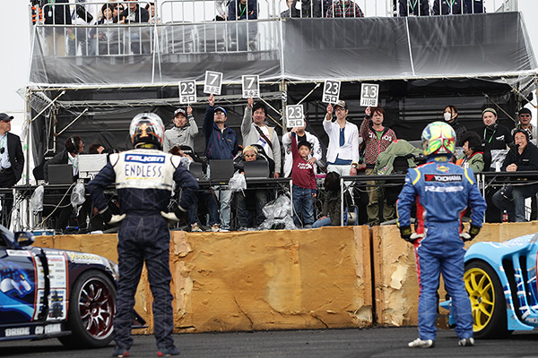 TOP4選手の単走は対戦方式。審査席に立った一般来場者の代表5名が判定した。 第1戦の翌日には、同会場でD1エキシビションマッチ『D1 QUICK 8×4(クイックエイトフォー)』が開催された。これは、過去のシリーズチャンピオンや優勝経験者、昨年のランキング上位選手に、前日の第1戦の上位選手3名を加えた、計24名による大会だ。