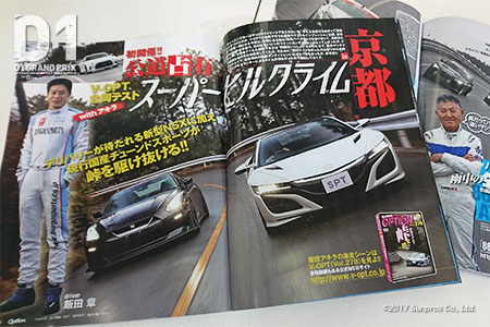 また、V-OPT合同特別企画『公道占有スーパーヒルクライムin京都』を特集。”チューニングカーはやっぱりストリートで走らせたいね”そんな会話から生まれた公道走行テスト&インプレッション企画。京都・嵐山-高尾パークウェイを借り切り、飯田章が車線またぎの限界ギリギリアタックを敢行。新型NSX・86・R35GT-R・WRX STIの過激な走りはV-OPT最新号でも楽しんでね!!
