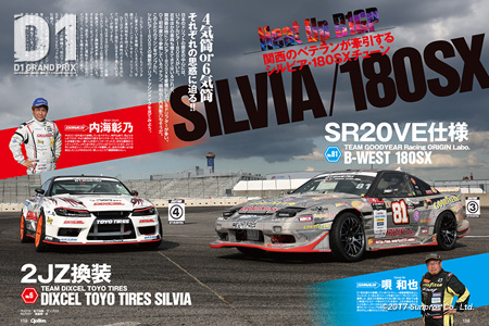 今月のオプション10月号の「Heat Up D1GP」では、今なおドリフターに支持されている車種、特に関西ドリフターに人気の高いシルビア&180SXチューンをピックアップ。ベテランD1ドライバーである内海と唄のマシンメイクをサンプルに最新のドリフトマシンメイクを検証してみた。パワー勝負のD1で戦うために2JZに換装した内海のシルビアは現代の競技向けシルビアの代表格。一方、唄の180SXは一般ユーザーが目指しやすいVEヘッド化SR20仕様になっている。2台の細かいスペックの違いにも注目してD1観戦をしても楽しんでみて欲しい。