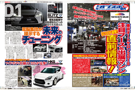 今月は新年特別号としてV-OPT監修の『オプションスーパーDVD』付録付き!! 新型スイスポ&チューンドKカーのイッキ乗りインプレ『The JAPANESE COMPACT』、タイムアタック世界最速決定戦『WTAC2017』世界中から集まった強豪タイムアタッカー、世界に挑むサムライアタッカー達の奮闘記など、見なきゃソンする爆走連発動画が満載!!